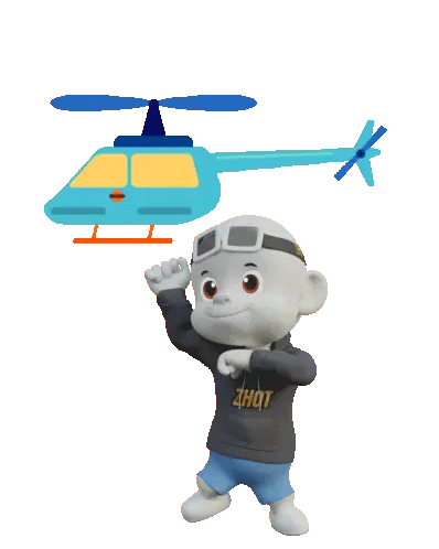 Joel Dawson character flying with a spinning propeller hat, referencing the popular "Helikopter Helicopter" meme.