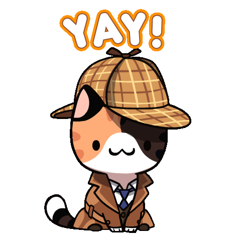 An excited calico cat detective wearing a hat and coat waves its arms, exclaiming "YAY!" in celebration.