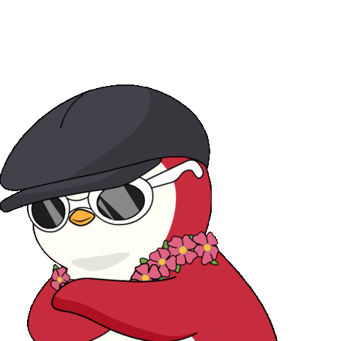 a penguin wearing a hat and sunglasses with flowers around its neck