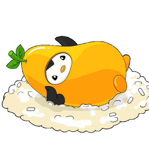 A cute Pudgy Penguin, shaped like a mango, waves hello while resting on a bed of sticky rice, a sweet Thai dessert.