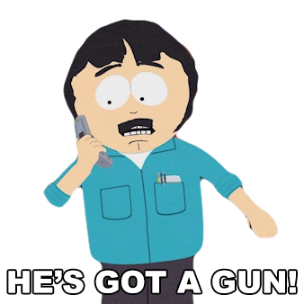 Randy Marsh from South Park frantically shouts 'He's Got A Gun!' while on the phone, eyes wide with alarm.