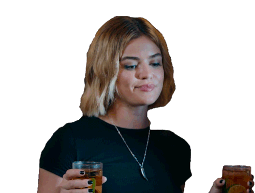 Lucy Hale as Melanie smiles subtly while holding two drinks, giving a friendly "Hey There" vibe.