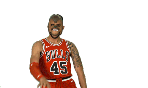 A person in a Chewbacca mask and Chicago Bulls jersey (number 45) dances and points, celebrating with enthusiasm.