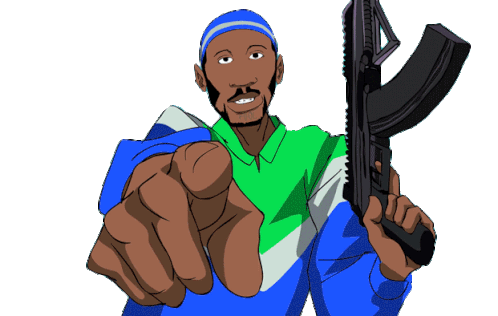 Shoreline Mafia cartoon man in a blue beanie and jacket, holding a gun and pointing directly at the viewer.