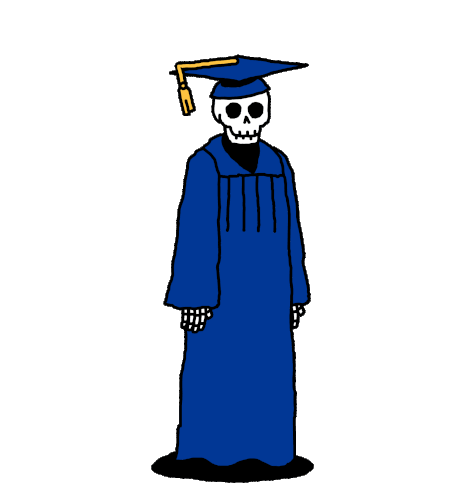 A skeleton in a graduation cap and gown gives a thumbs up before melting into a blue puddle.