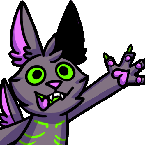A cute animated cartoon bat with green eyes and purple ears greets you with 'Hi Hello' in this friendly sticker.