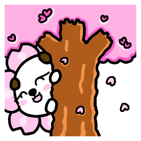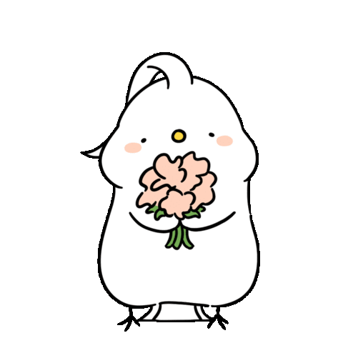 A cute, white, bird-like chick character holds a bouquet of hibiscus and cherry blossoms while petals float around it.