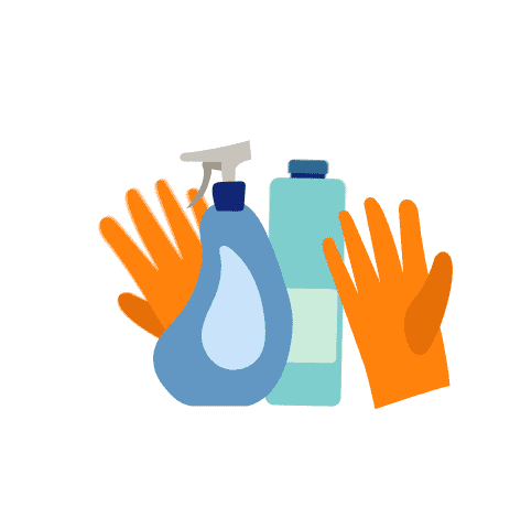 An animated sticker featuring various cleaning supplies, including gloves, a spray bottle, and a detergent bottle.