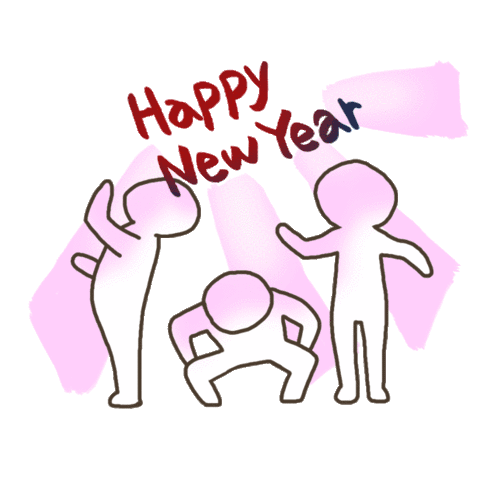 A cute mouse character in a traditional hanbok top stands on a drum, unrolling scrolls with 'P Y' for Happy New Year amidst confetti.
