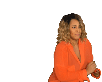 Holly Logan energetically dances and grooves, celebrating with happy movements in her orange shirt.