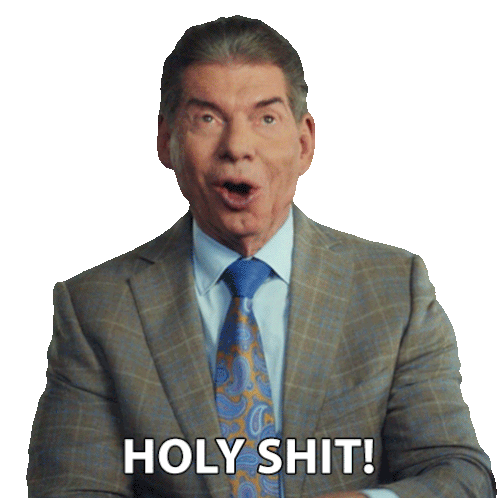 Vince McMahon, wearing a suit and tie, reacts with a surprised expression, exclaiming 'Holy Shit!'