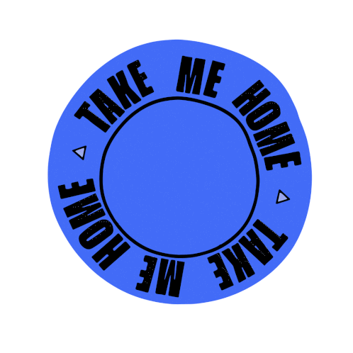 A blue circular sticker featuring a UFO beaming up a small object, with the rotating text 'TAKE ME HOME' around the edge.