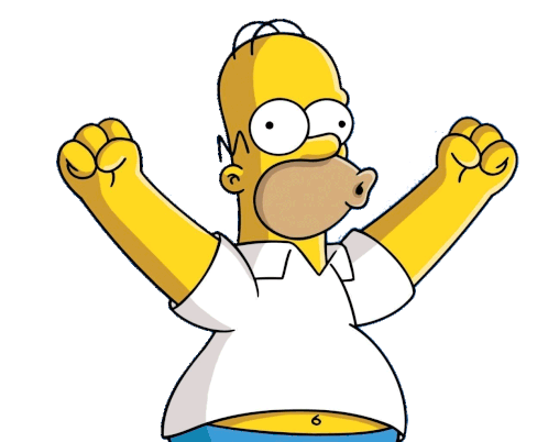 Homer Simpson, the iconic character, raises his arms in excitement with a wide-open mouth and eyes.