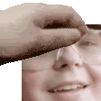 Homola Homola Squish sticker featuring a person with glasses having their face comically squished by a hand.