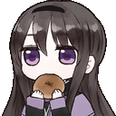 a cartoon girl with long black hair and purple eyes is eating a donut .