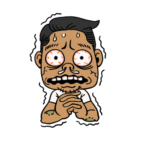 A cartoon character with wide eyes and an open mouth, showing a horrified and panicking reaction to something shocking.