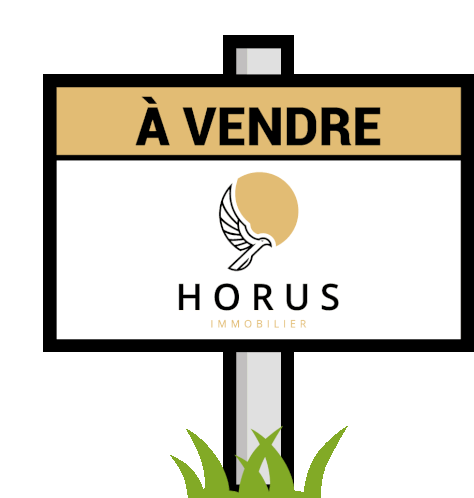 A clear 'À VENDRE' (For Sale) sign from Horus Immobilier, featuring their distinctive bird logo, perfect for real estate listings.