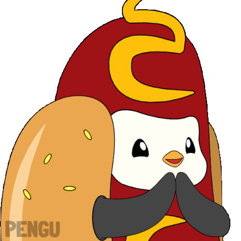 a penguin in a hot dog costume has the word pengu on the bottom right