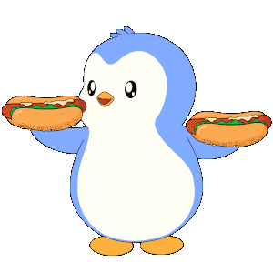 An adorable cartoon penguin happily holding two delicious hotdogs, ready to enjoy a tasty snack.