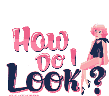 Frenchy from Grease poses and blows a bubble gum bubble, asking 'How Do I Look?' for the 40th anniversary.