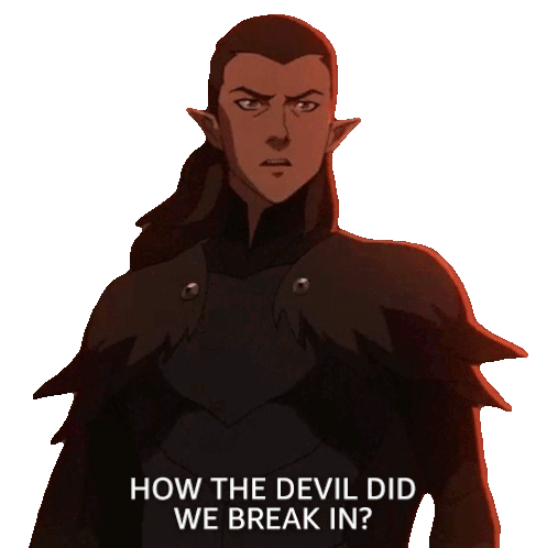 Vax'ildan from The Legend of Vox Machina asks, 'How the devil did we break in?' in this animated sticker.