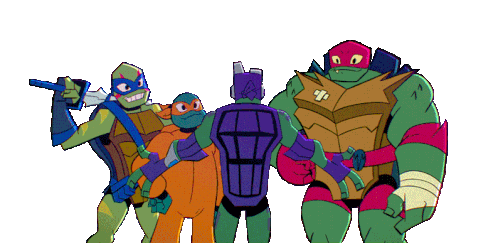 Donnie, Leo, Mikey, and Raph from Rise of the Teenage Mutant Ninja Turtles share a warm, loving group hug.