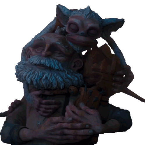 Geppetto shares a tender hug with Pinocchio, showcasing a heartwarming moment from Guillermo Del Toro's stop-motion film.