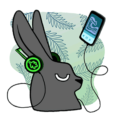 A cute rabbit with green headphones enjoys music from a smartphone, swaying gently to the rhythm.