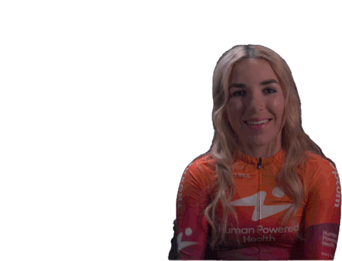 Kaia Schmid from Human Powered Health smiling and pointing upwards with both hands, a positive gesture.