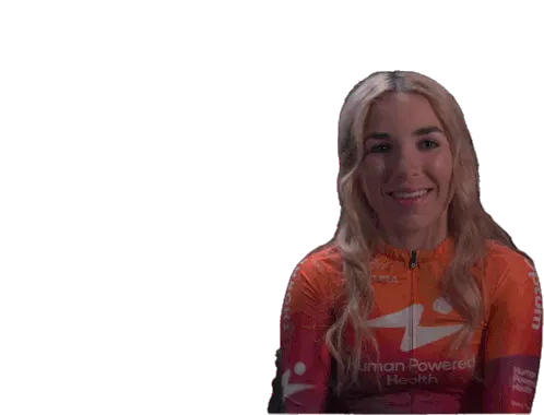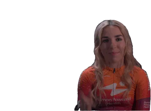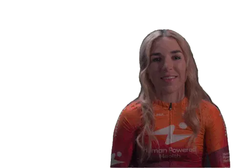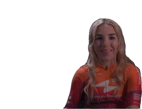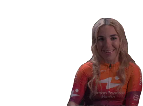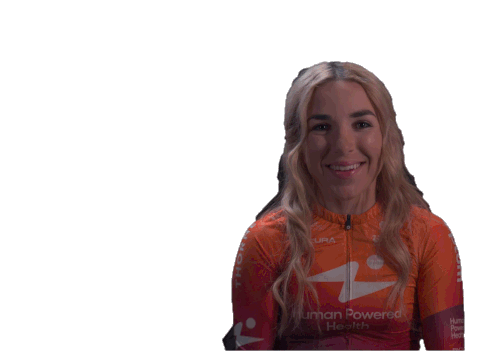 Kaia Schmid, wearing her Human Powered Health jersey, smiles brightly and points both index fingers up in a gesture of triumph.