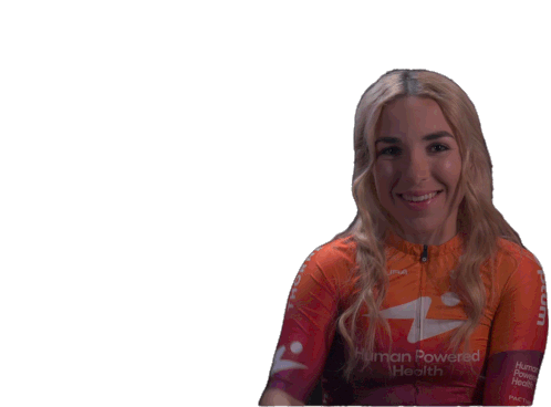 Kaia Schmid, wearing her Human Powered Health cycling jersey, smiles and flashes a peace sign, showing a positive and friendly gesture.