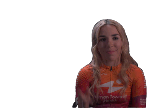Kaia Schmid, a Human Powered Health athlete, taps her temple thoughtfully, indicating she's thinking or remembering something.