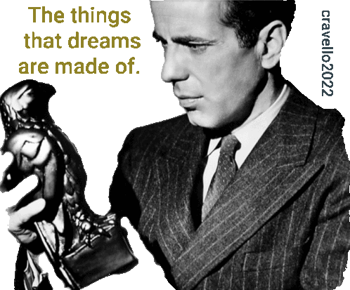 a man in a suit and tie holding a statue with the words the things that dreams are made of