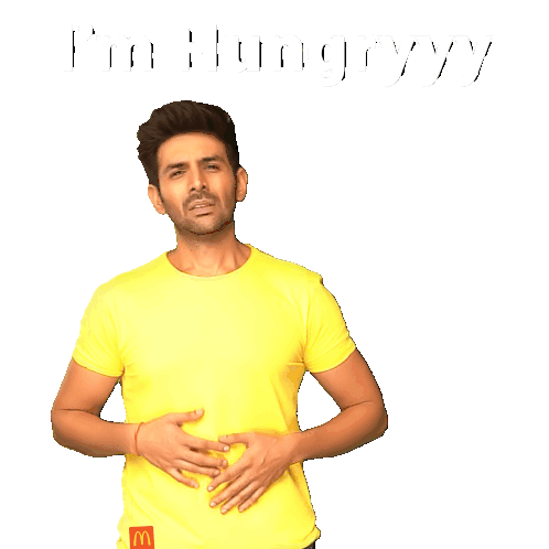Kartik Aaryan expresses his hunger, rubbing his belly with a McDonald's logo visible, saying 'I'm Hungryyy!'