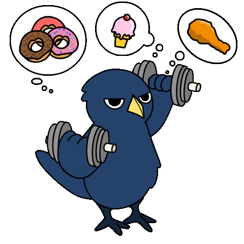 A determined cartoon bird lifts dumbbells, eyes fixed on its workout, while dreaming of delicious treats like donuts, ice cream, and fried chicken.