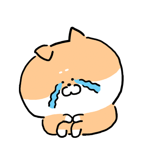 A cute, round, light brown and white puppy dog character is crying with blue tears, looking sad and frustrated.