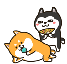 A Husky fans a hot Shiba Inu licking a lollipop, featuring the popular 二哈萌柴2微信表情 characters.