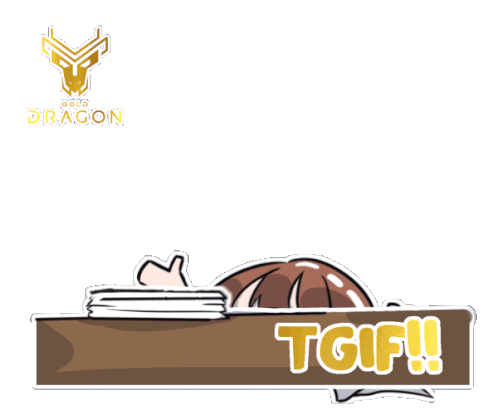 A cheerful girl from Gold Dragon celebrates TGIF, throwing her hands up in excitement as papers fly around her.
