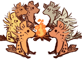 A group of cute, stylized hyenas huddle together around a warm, crackling campfire, creating a cozy and friendly scene.