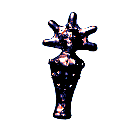 A stylized figure splits open, revealing an intricate inner form, symbolizing rebirth and emergence from a tomb.