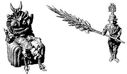 A pixel art sticker from Hylics featuring a horned figure seated on a throne and an armored spear bearer. The spear extends and retracts.