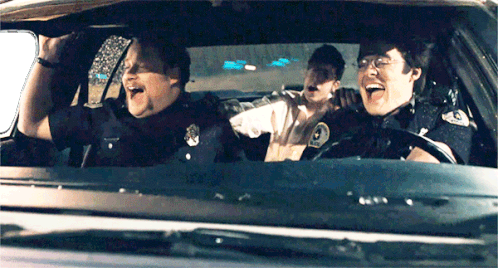 Bill Hader as Officer Slater, Seth Rogen as Officer Michaels, and Christopher Mintz-Plasse as Fogell (McLovin) are hyped and excited during a car ride in Superbad.