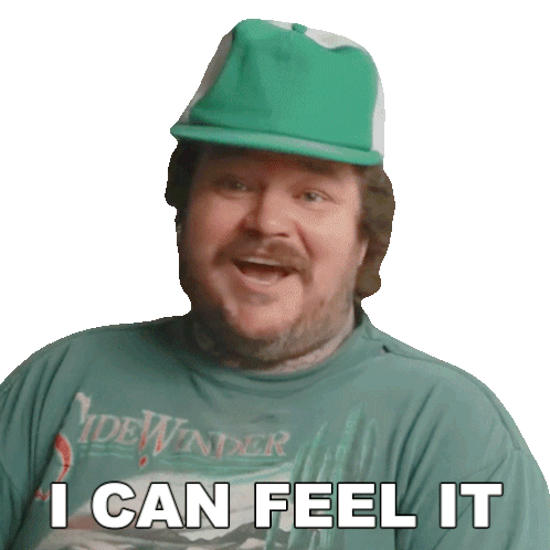 Matty Matheson, wearing a green hat, smiles and nods, expressing a strong feeling with the caption 'I CAN FEEL IT'.