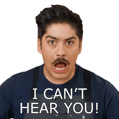 Victor Nevárez animated sticker showing him with an exasperated expression, mouthing 'I Can't Hear You!' to someone speaking too softly.
