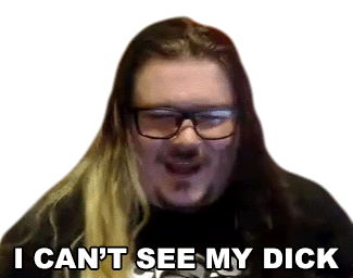 Celticcorpse, a man with long hair and glasses, humorously states 'I Can't See My Dick' in this relatable sticker.