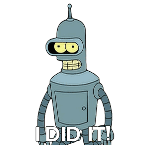 Bender from Futurama proudly exclaims 'I Did It!' with a wide, toothy grin, celebrating a successful accomplishment.