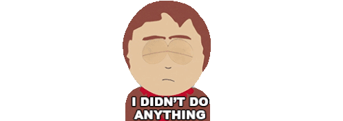 Sharon Marsh from South Park emphatically states 'I didn't do anything,' denying responsibility with a wide-eyed, worried expression.