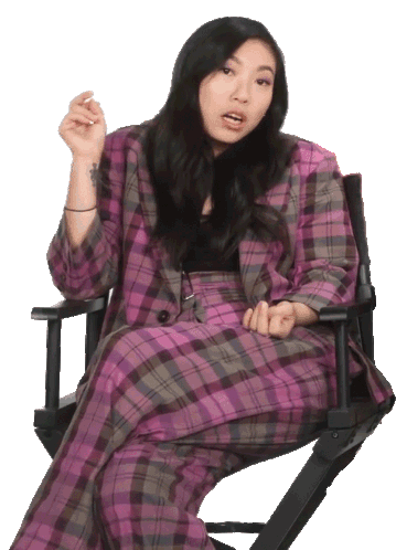 Awkwafina sits in a plaid suit, gesturing with a dismissive or confused expression, saying 'I don't care, I don't know her.'