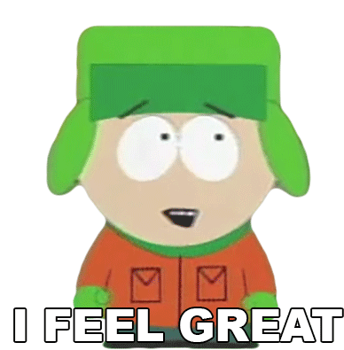 Kyle Broflovski from South Park, looking distressed but declaring 'I FEEL GREAT' in a classic ironic moment.