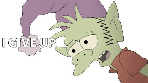 Elfo from Disenchantment looks defeated and says 'I give up' in this animated sticker, expressing resignation.